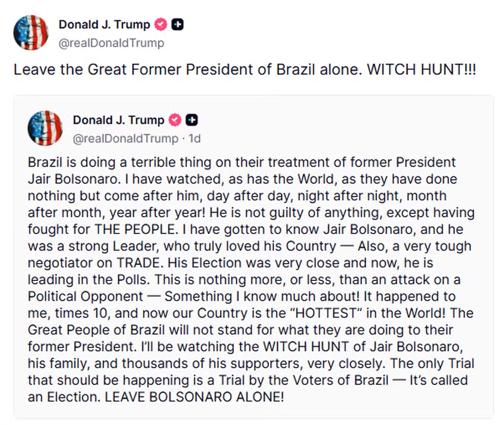 Na segunda (7), Trump já havia feito uma postagem defendendo o ex-presidente. O republicano disse que Bolsonaro é alvo de perseguição, também na Truth Social. Nessa nova manifestação, Trump compartilhou o post anterior.